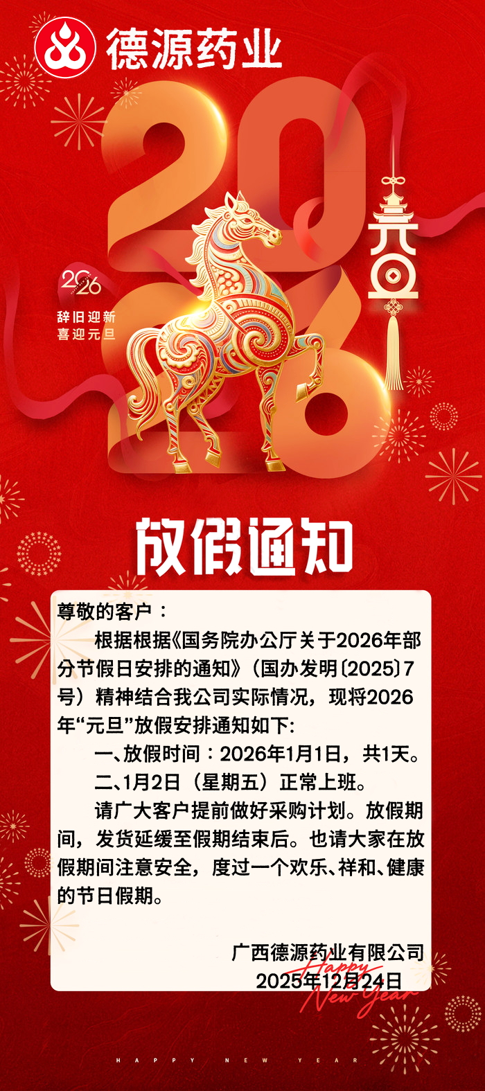 德源药业--2026年元旦放假通知